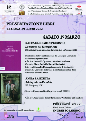 >> 17 marzo, presentazione dei libri La Musica nel Risorgimento e Addio mia bella addio, organizzata in collaborazione con il Conservatorio Cherubini 11/03/2012 by Comitato Fiorentino per il Risorgimento Info Comitato Fiorentino per il Risorgimento Comitato Fiorentino per il Risorgimento – redazione web Post precedente:17 Marzo : Firenze celebra il giorno della nascita dell’Unità italiana. ore 12: Sbandieratori in Piazza della Signoria. Ore 17: Musica e libri a Villa Favard