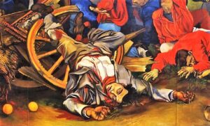 Sulla sinistra riverso a terra c’è il suo autoritratto. Renato Guttuso si rappresentava così, 70 anni fa, quando lavora alla Battaglia di Ponte dell’Ammiraglio per la Biennale di Venezia del 1952. Come un garibaldino, partecipe, con le truppe del generale, allo scontro contro i Borbone che vide vittoriosi i Mille sul punto di conquistare Palermo. Non solo, avrebbe scritto lui stesso in una lettera pubblicata dall’Espresso il 10 gennaio 1965: «Nel gruppo dei Garibaldini, in alcune teste, più per mia comodità di sentire viva e vicina una vicenda storica, che per altro, mi sono servito di somiglianze con garibaldini di Spagna e della Resistenza. Tra essi Luigi (e non Giuseppe) Longo, Pajetta, Vidali, Trombadori, e un paio di autoritratti (il contadino morto sul carretto sfasciato) e un altro che voleva essere un omaggio a mio nonno Ciro Guttuso, il quale aveva partecipato allo scontro di Ponte Ammiraglio» (è il garibaldino con la spada sguainata al centro della tela ndr.).