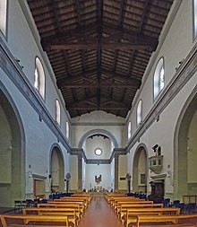 L’interno, a navata unica con due cappelle per lato, mostra un chiaro omaggio all’architettura brunelleschiana, col ricorso alla pietra serena e agli intonaci bianchi. In cima ai pilastri corre un fregio continuo, con angeli alternati al monogramma di Cristo. Le finestre hanno vetrate della vetreria Polloni, con l’Incoronazione della Vergine (facciata), la Trinità (abside), Angeli, Santi ed Evangelisti (ai lati).