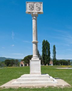 Nella pianura di Campaldino, vicino all’abitato di Poppi, l’11 giugno 1289 si è svolta una storica battaglia fra le truppe fiorentine guidate da Guglielmo di Durfort e quelle aretine guidate dal vescovo Guglielmino degli Ubertini. Allo scontro, arruolato nella cavalleria fiorentina, prese parte anche Dante Alighieri, che nel Canto Quinto del Purgatorio ci ha lasciato un sublime ricordo di questo evento con la narrazione della morte di Bonconte da Montefeltro. In memoria della battaglia, intorno agli anni 20 del secolo scorso, è stata realizzato in Campaldino un monumento, costituito da una colonna-stele con capitello poggiata su un basamento, tutto in travertino.