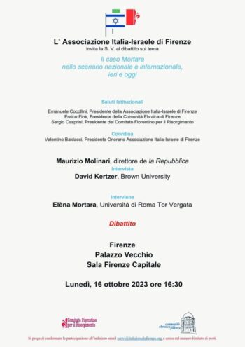 L’iniziativa è pronta da mesi, nata dalla volontà di rileggere dopo oltre un secolo e mezzo, alla luce dell’attuale contesto storico e culturale — italiano e (come fu anche allora) internazionale — una vicenda drammatica dal punto di vista umano, e fortemente simbolica dal punto di vista religioso e politico. Ma è ovvio che fare il punto adesso, sullo sfondo della guerra in corso in Israele, sul caso del bambino ebreo bolognese Edgardo Mortara — battezzato di nascosto da una domestica, fatto rapire nel 1858, in quanto ormai “cristiano’’, da papa Pio IX, e mai più restituito alla famiglia, su cui nel 2023 ha riportato l’attenzione il film di Bellocchio Rapito — , offre un’ulteriore occasione per riflettere sulle complesse dinamiche che in ogni epoca, in Italia come altrove, caratterizzano le relazioni col mondo ebraico. “Il caso Mortara nello scenario nazionale e internazionale, ieri e oggi”, è il titolo del dibattito organizzato dall’Associazione Italia Israele di Firenze con il sostegno del Comitato Fiorentino per il Risorgimento e della Comunità ebraica di Firenze, che si terrà lunedì 16 ottobre, in Palazzo Vecchio (Sala Firenze capitale, ore 16,30) con la partecipazione di David Kertzer, intervistato dal direttore di Repubblica Maurizio Molinari, e di Elèna Mortara.