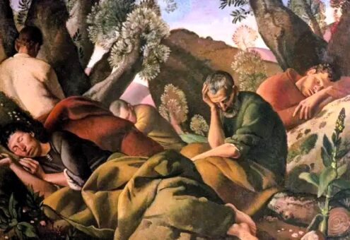 È il titolo a dirci che si tratta, invece, dell’orazione sul Monte degli Ulivi. Manca il protagonista, Gesù, che sta pregando lì vicino e tra poco sorprenderà gli apostoli dormienti, inconsapevoli dell’imminente Passione. Abolendo la figura del Cristo Carena avrà inteso attenuare la forza della scena evangelica, o invece esaltarla avvolgendola nel silenzio? Certo anche qui le figure s’incastrano fra tronchi e ciuffi di foglie come campiture di colore, ma il soggetto sacro impone il proprio racconto.