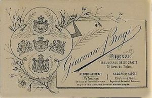 Il fiorentino Giacomo Brogi è stato un fotografo del XIX secolo. All’età di 11 anni iniziò a lavorare presso l’editore Batelli e frequentò la scuola d’incisione del Perfetti. Successivamente passò a lavorare con il calcografo Achille Paris come ritoccatore. Iniziò la sua attività lavorativa di fotografo nel 1856 circa e fondò una propria ditta attorno al 1864, Edizioni Brogi Firenze, specializzata in ritrattistica e successivamente in fotografie di opere d’arte, in particolare nella riproduzione della scultura e nelle panoramiche. Eseguì diverse campagne fotografiche nelle regioni italiane e ne organizzò una importante in Medio Oriente, in particolar modo fotografando i Luoghi Santi, venendo insignito per questo ultimo lavoro di medaglia d’argento dal papa Pio IX. La Ditta Brogi partecipò nel 1873 all’esposizione di Vienna, nel 1881 a quella di Milano e nel 1889 partecipò all’Esposizione Universale di Firenze, esponendo opere fuori concorso a puro titolo di patrocinio. Alla sua morte la gestione dell’attività passò al figlio Carlo Brogi (1850-1925), uno dei promotori della Società Fotografica Italiana, e cessò nel 1950.