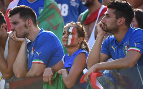 Italy fans react after the Group D football match between Italy and Uruguay at the Dunas Arena in Natal during the 2014 FIFA World Cup on June 24, 2014. AFP PHOTO / EMMANUEL DUNAND